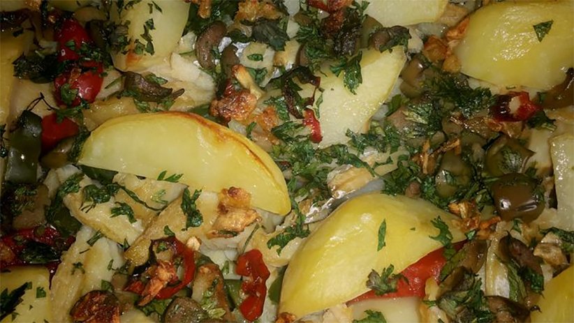 500 gramas de bacalhau — 4 ovos — 2 colheres de farinha de trigo — tomates — cebo-las, alho, coentro, cheiros verdes, etc. etc.