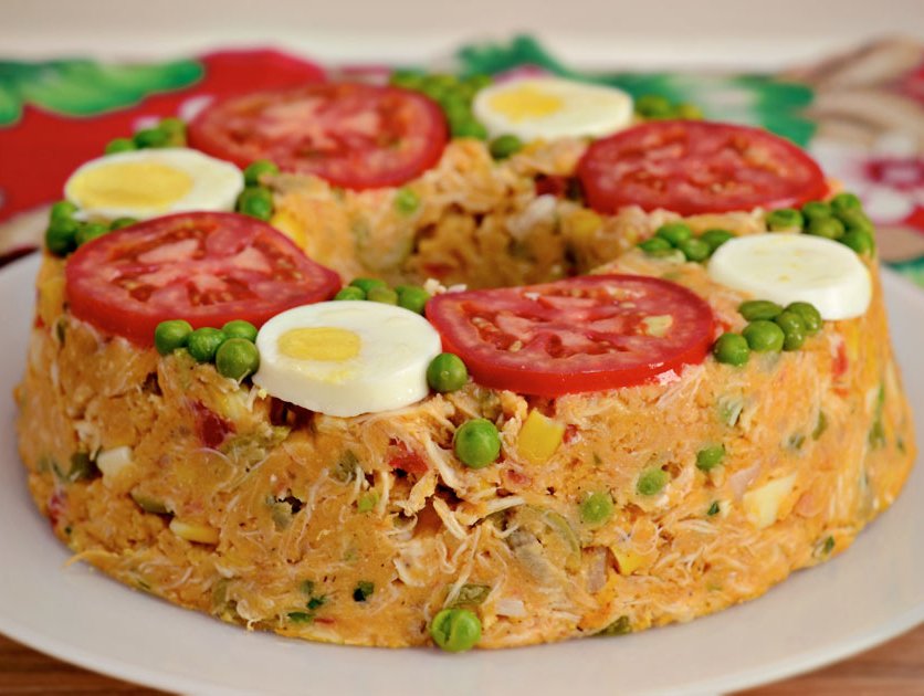 Unte uma fôrma de buraco no meio de 26cm de diâmetro e decore com tomate, ervilha e ovo. Espalhe o cuscuz, apertando com a mão, cubra e deixe descansar por 30 minutos. Desenforme e sirva.