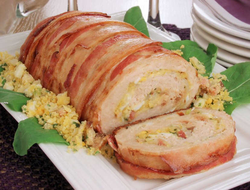 Para o recheio, em uma panela, frite o bacon na própria gordura, em fogo médio, até dourar. Junte a manteiga, a cebola e refogue por 3 minutos. Misture a farinha, os ovos, sal, cheiro-verde e reserve.