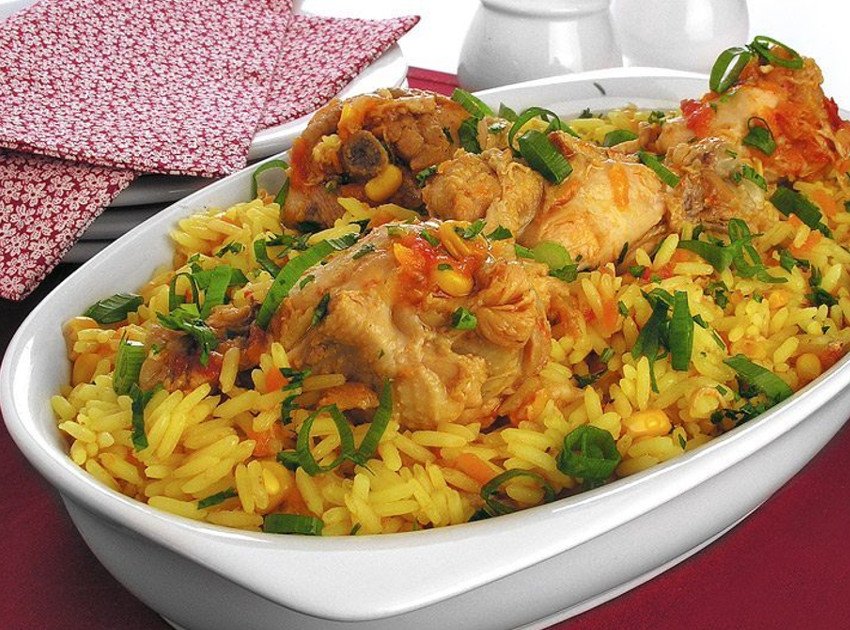 Aqueça uma panela com o óleo, em fogo alto, e frite o frango temperado com sal e pimenta até dourar. Retire e reserve. Na mesma panela, junte a cebola, o alho e refogue por 3 minutos. Adicione o açafrão, o arroz e frite por 3 minutos. Despeje o frango, o milho, o caldo de galinha dissolvido na água, tampe e cozinhe, em fogo baixo, por 30 minutos. Se necessário, acrescente mais água. Junte a cenoura, o tomate, tampe e cozinhe por mais 10 minutos. Desligue e deixe descansar por 10 minutos com a panela tampada. Transfira para uma travessa, polvilhe com o cheiro-verde e sirva.
