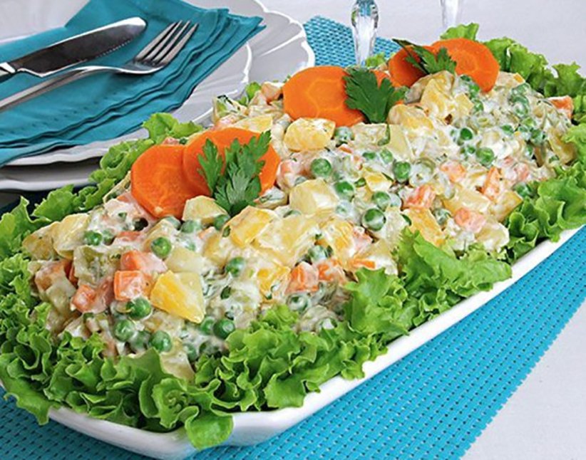 Para a maionese, bata no liquidificador o leite, o caldo de legumes e a gema. Sem parar de bater, adicione o óleo, em fio, até engrossar e obter ponto de maionese. Se necessário, adicione mais óleo. Reserve. Em uma tigela, misture a cenoura, a vagem, a ervilha, a mandioquinha e a mandioca. Junte a maionese reservada e misture. Tempere com sal, pimenta e cheiro-verde. Cubra com filme plástico e leve à geladeira por 1 hora. Forre uma travessa com folhas de alface, arrume a maionese por cima e decore com cenoura e salsinha. Sirva.