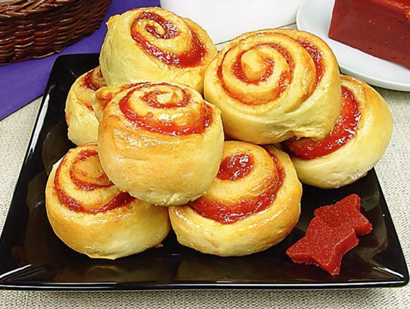Divida a massa em 2 porções e abra com um rolo em uma superfície enfarinhada até obter dois retângulos grandes. Espalhe a goiabada sobre as massas e enrole como rocamboles, apertando para fechar as extremidades. Com uma faca, corte fatias a cada 2cm e coloque em uma fôrma untada.