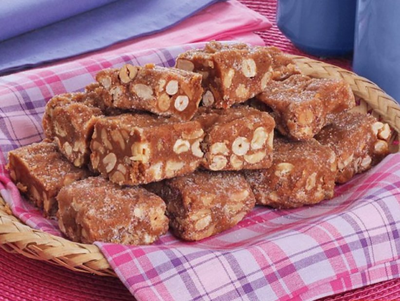 Misture o açúcar, o amendoim e o bicarbonato em uma panela grande e grossa, e leve ao fogo baixo, mexendo sempre, por 10 minutos ou até o açúcar caramelizar levemente. Retire do fogo, misture o leite condensado, o chocolate, a margarina, o sal e volte ao fogo médio por 5 minutos, mexendo sempre até engrossar. Despeje em uma superfície lisa untada, alisando com uma espátula. Deixe esfriar, corte em quadrados, passe por açúcar e sirva.